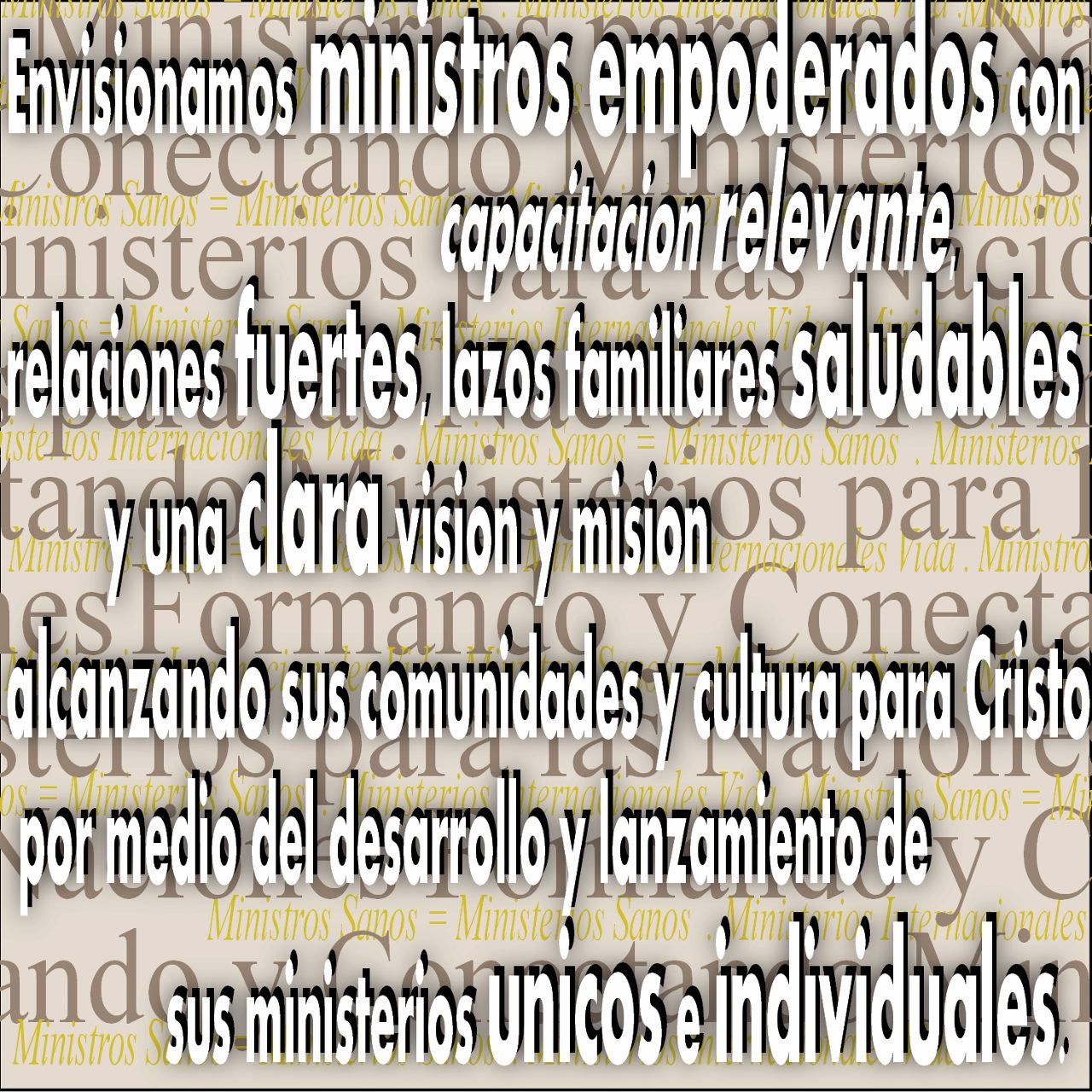 Envisionamos ministros empoderados con capacitacion relevante, relaciones fuertes, lazos familiares saludables y una clara vision y mision alcanzando sus comunidades y cultura para Cristo por medio del desarrollo y lanzamiento de sus ministerios unicos e individuales.